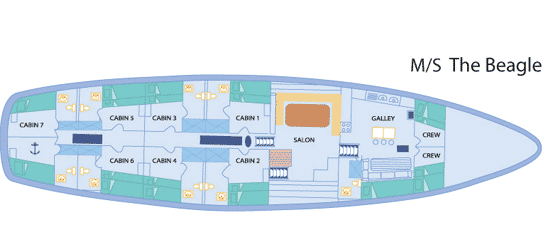 6 double cabins and 1 smaller double with private bathrooms & A/C |